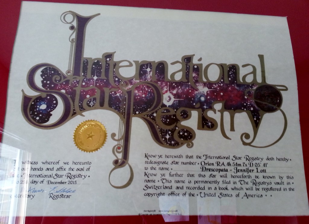My sappy and wonderful husband decided that although Drescopata is my make-believe planet, this doesn’t mean that it can’t be a real star! Someday, if my novel series becomes well known, it will be an added bonus that the fans can search the night sky for the star named after Drescopata.
